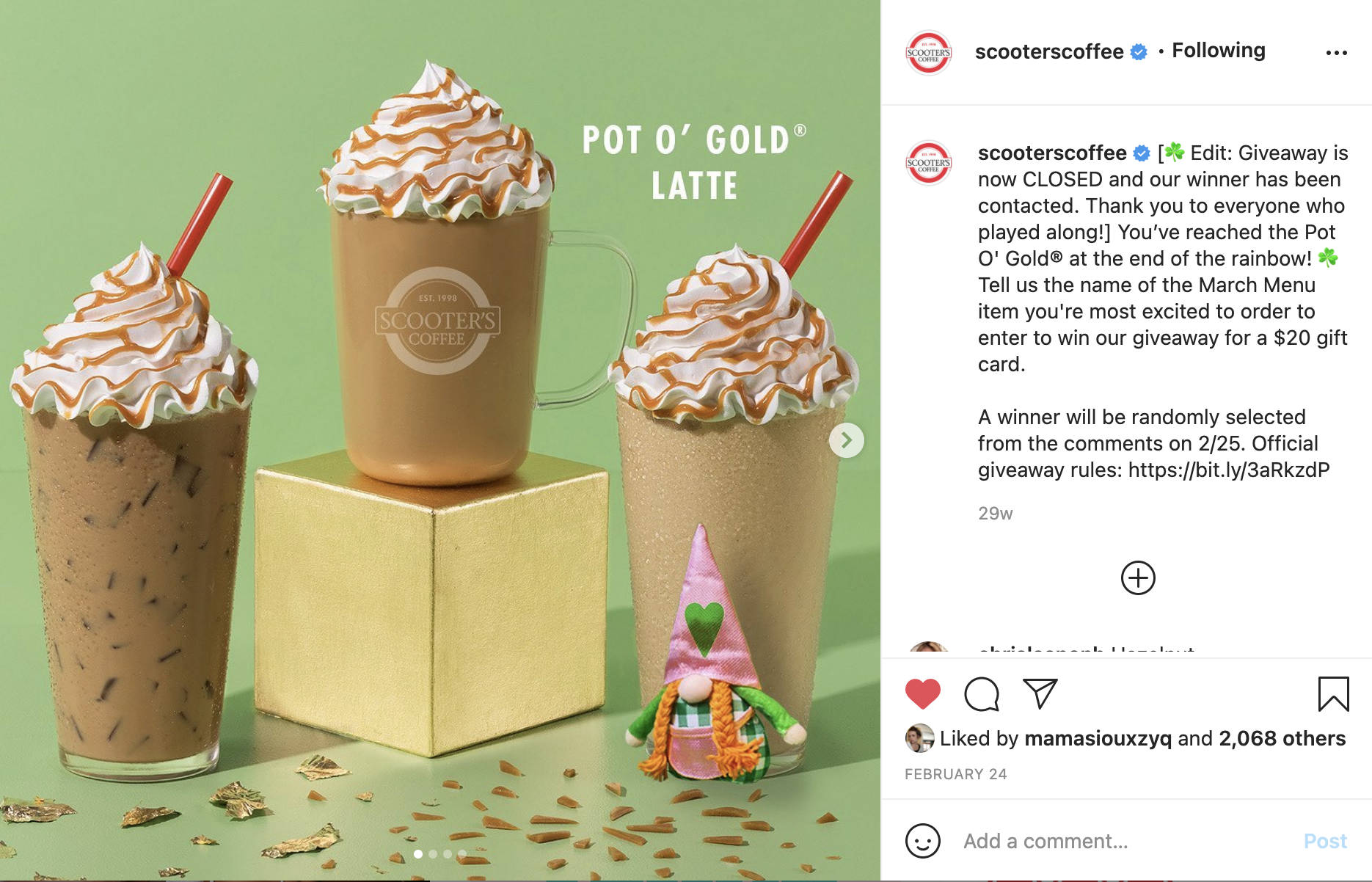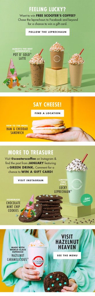 For my first @ScootersCoffee digital campaign, I created an interactive scavenger hunt that led customers through email, site, and social media accounts for a giveaway. It was a huge success and the most interacted-with post and email at that date. The hunt helped raise awareness for Scooter’s limited-time spring menu launch.